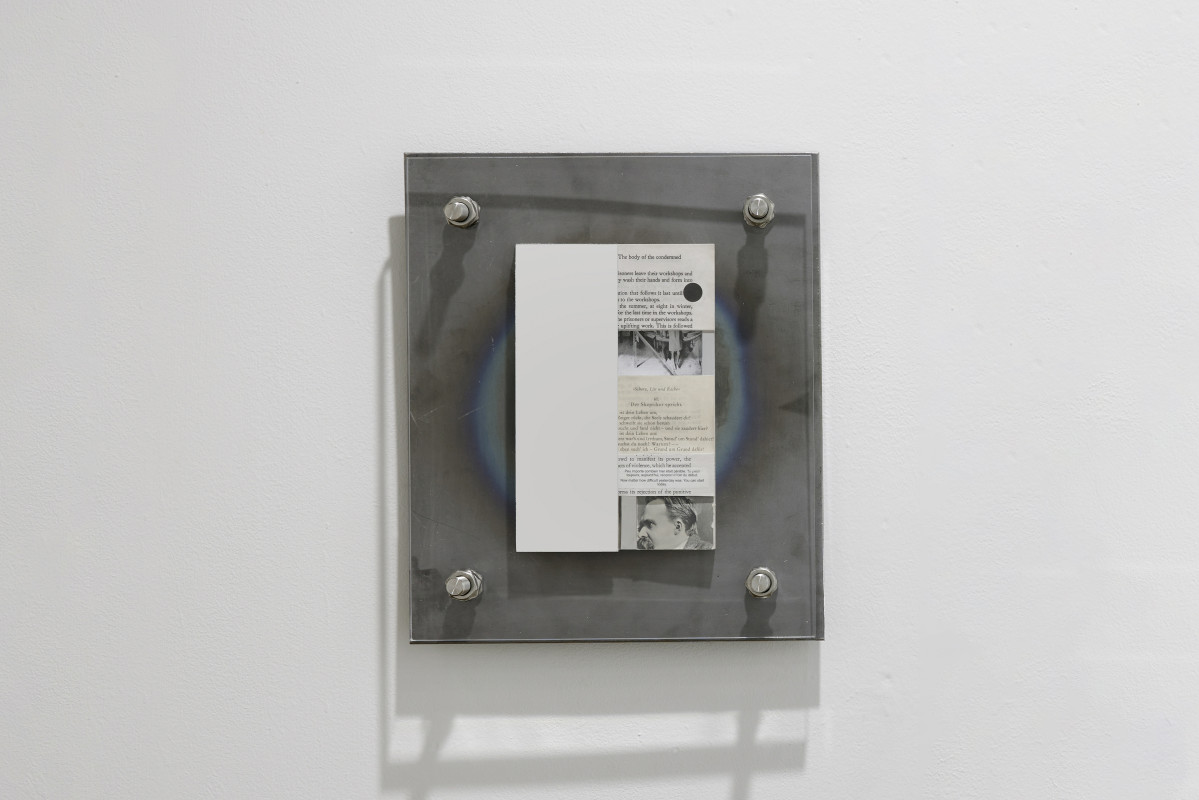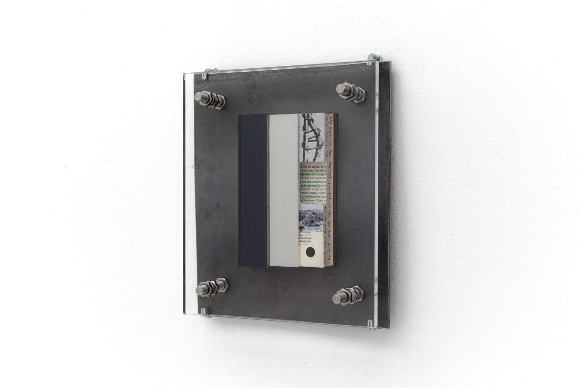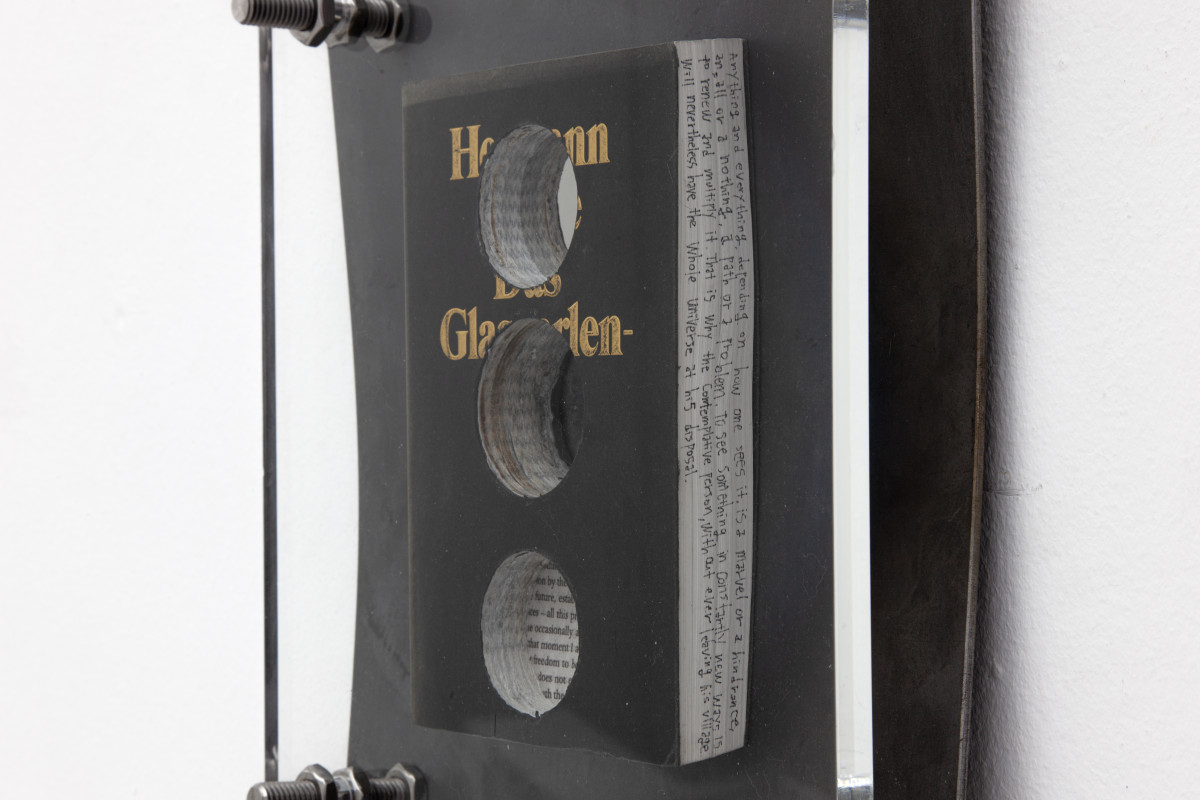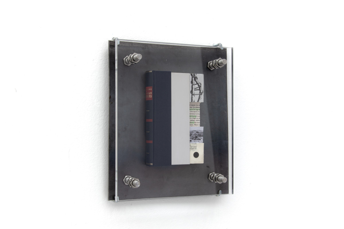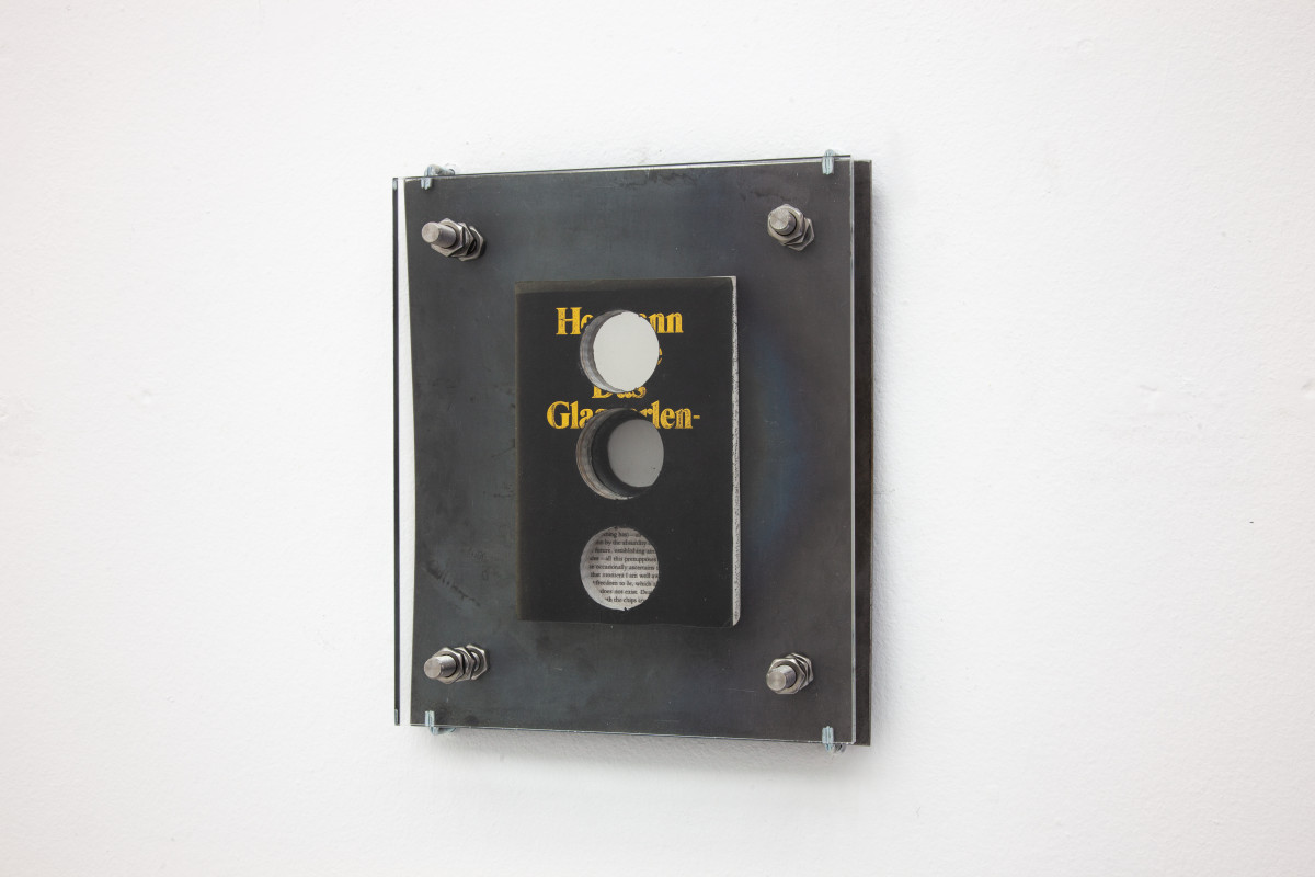Plexiglass, Steel, Stainless steel, Industrial PUR, The Glass Bead Game by Hesse, The Myth of Sisyphus by Camus,Thus Spoke Zarathustra by Nietzsche, Discipline and Punishment by foucault, Beneath the Wheel by Hesse, Image of Sisyphus painting by Titian,Portrait of Albert Camus