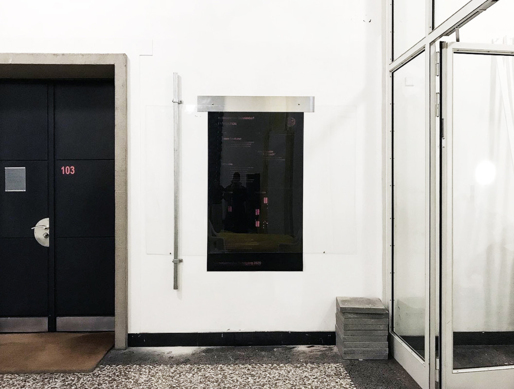 Artist removed the original notice board which belongs to the president of kunstakademie Düsseldorf and installed a new notice board on the wall. The Form, Composition, and Font are exactly the same as the original notice board. The contents are written by the artist.