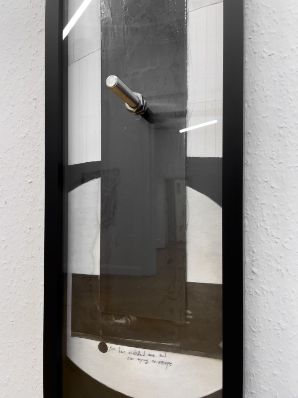 Construction metal plate, Oil, Industrial PUR, Paper tape,Fortune cookie, Acrylic paint, Hahnemühle paper, Stainless steel, Bolt and Nut