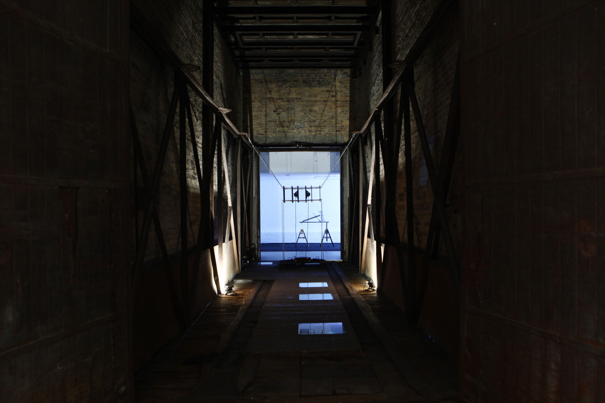 Speaker, Stainless steel, Acrylic glass, Steel-chain, Aluminum, Deep-black color Sound : Recorded sounds of AI-Human voice, MRI(Magnetic resonance imaging) machine, Water