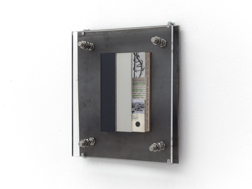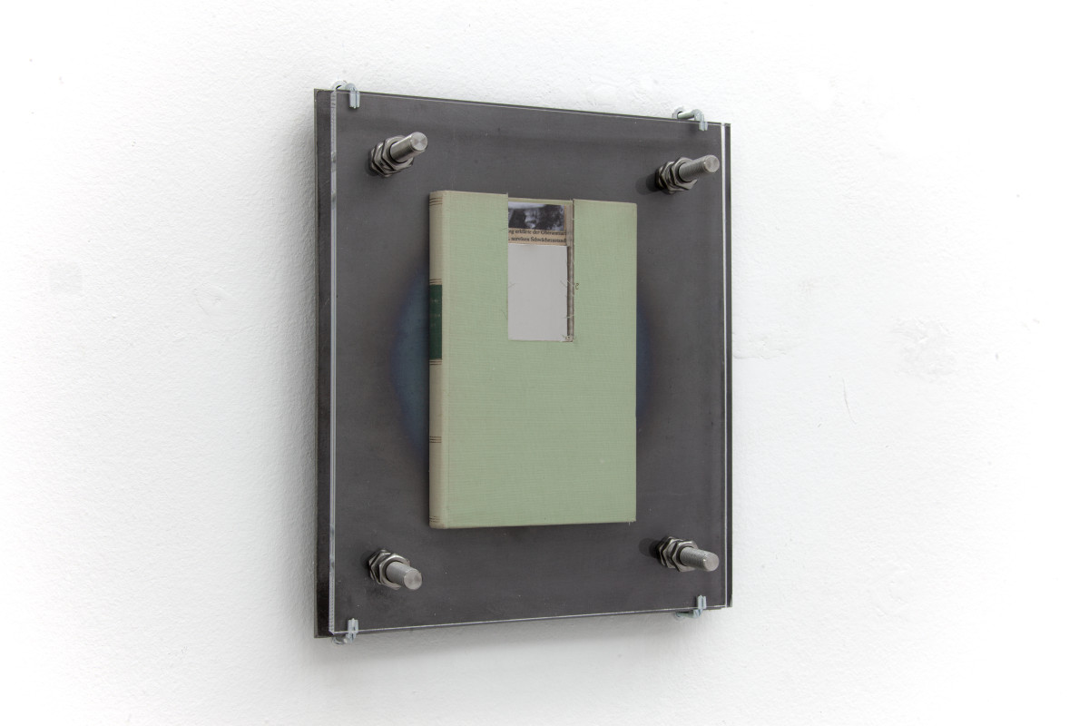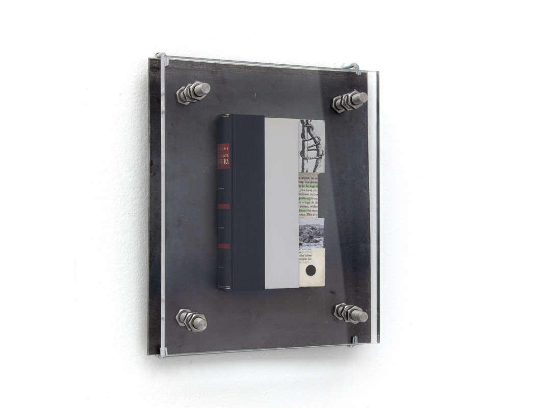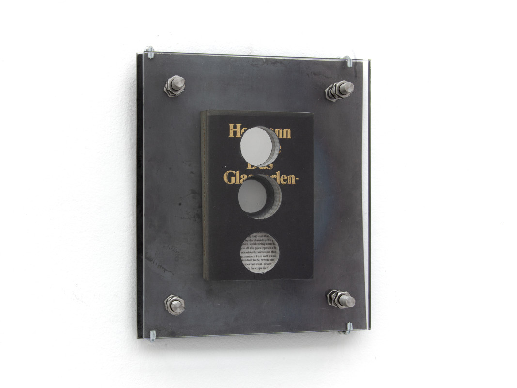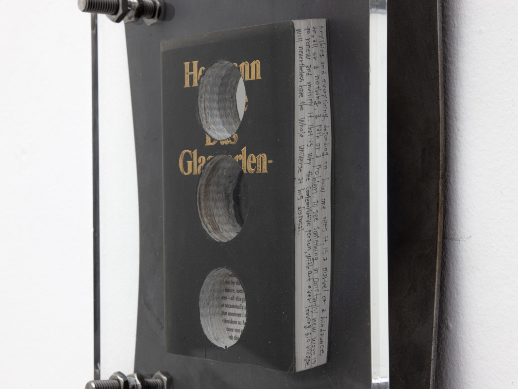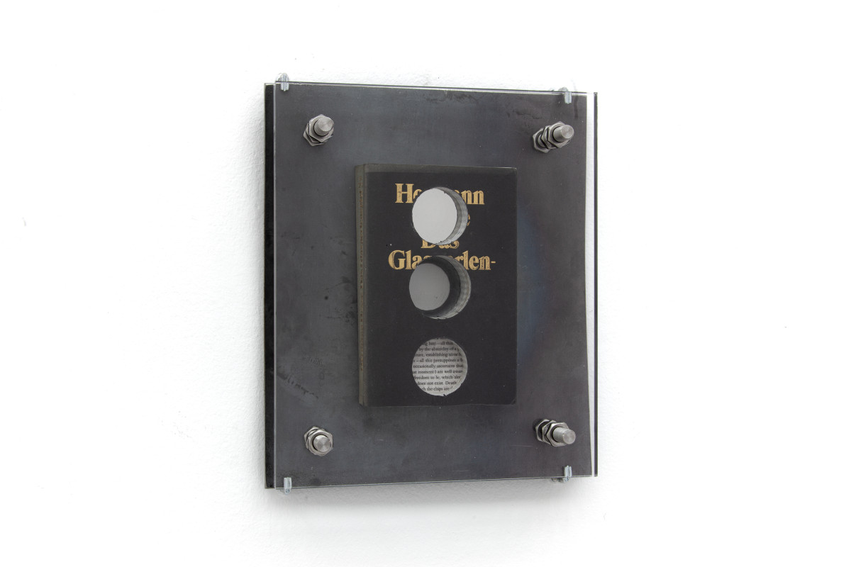 Plexiglass, Steel, Stainless steel, Industrial PUR, The Glass Bead Game by Hesse, The Myth of Sisyphus by Camus,Thus Spoke Zarathustra by Nietzsche, Discipline and Punishment by foucault, Beneath the Wheel by Hesse, Image of Sisyphus painting by Titian,Portrait of Albert Camus