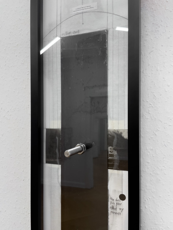 Construction metal plate, Oil, Industrial PUR, Paper tape,Fortune cookie, Acrylic paint, Hahnemühle paper, Stainless steel, Bolt and Nut